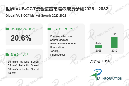 LP Information調査チームの最新レポートである「世界IVUS-OCT統合装置市場の成長予測2026~2032」(https://www.lpinformation.jp/reports/598717/ivus-oct)によると、2026年から2032年の予測期間中のCAGRが20.6%で、2032年までにグローバルIVUS-OCT統合装置市場規模は1.25億米ドルに達すると予測されている。市場を牽引する要因としては、第一に複雑化する冠動脈疾患症例への対応ニーズ、第二にIVUSおよびOCT単体機器の普及による医師側の受容性向上、第三に治療成績の可視化を重視する医療制度・保険者の姿勢が挙げられる。一方で、装置価格の高さ、学習コスト、施設側の投資回収期間の長さは導入障壁として存在する。また、二つのモダリティを統合する技術的難易度、データ解釈の標準化、臨床エビデンスの蓄積といった課題も残る。しかしこれらの制約は、市場拡大を抑制する要因であると同時に、参入企業の技術力と臨床連携力を峻別する要素として機能している。