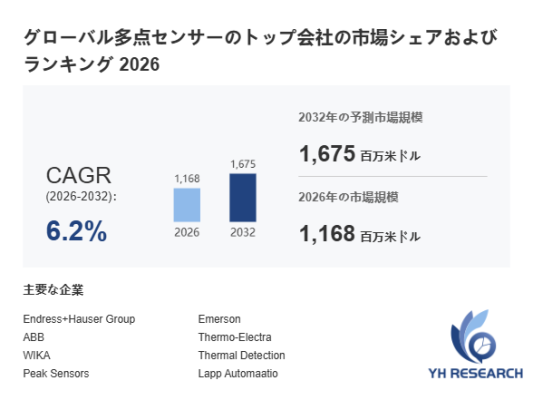 YHResearch調査チームの最新レポート「グローバル多点センサーのトップ会社の市場シェアおよびランキング 2026」によると、2026年の1168百万米ドルから2032年には1675百万米ドルに成長し、2026年から2032年の間にCAGRは6.2%になると予測されています。