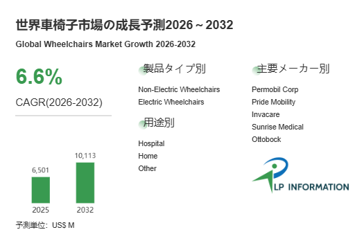 LP Information の最新レポート「世界車椅子市場の成長予測2026~2032」(https://www.lpinformation.jp/reports/693104/wheelchairs)に基づき、世界の車椅子市場は高い成長勢いを維持している。2025 年の世界市場規模は 65 億 1 万米ドルで、2026~2032 年の年平均成長率は 6.6%と予測され、2032 年には 101 億 13 万米ドルに達する見込みだ。市場の成長は、人口高齢化や慢性疾患を抱えた人々の生存期間の延長による移動障害者の増加、病院、リハビリセンター、介護施設、在宅介護サービスの普及による需要拡大が主な牽引要因となっている。また、消費者の期待は「基本的な移動」から「目的に合った移動」へと変化し、軽量フレーム、優れた人間工学、圧力管理、専門化された座席・体位調整機能を備えた製品への需要が高まっている。電動車椅子は、バッテリー、駆動システム、操作インターフェースの進化により普及が加速している。
