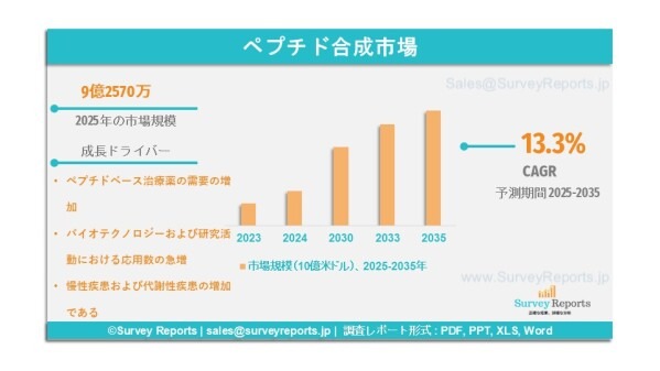 Surveyreportsの専門家による分析によれば、ペプチド合成市場の規模は2025年に9億2570万米ドルであったとされる。さらに、2035年末までには25億7660万米ドルに達する収益が見込まれている。ペプチド合成市場は、2025年から2035年の予測期間において約13.3%の年平均成長率(CAGR)で成長すると予測されているものである。