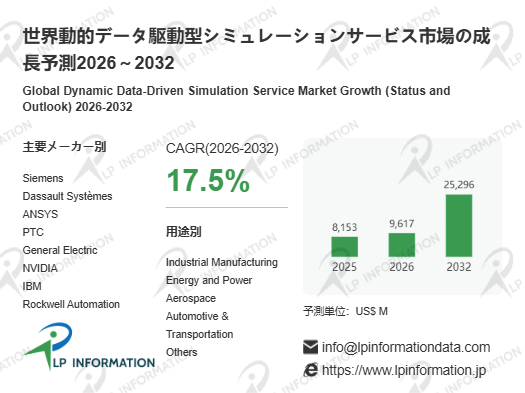 LP Information調査チームの最新レポートである「世界動的データ駆動型シミュレーションサービス市場の成長予測2026~2032」(https://www.lpinformation.jp/reports/601025/dynamic-data-driven-simulation-service)によると、2026年から2032年の予測期間中のCAGRが17.5で、2032年までにグローバル動的データ駆動型シミュレーションサービス市場規模は252.96億米ドルに達すると予測されている。この成長は企業のデジタル変革、AI・IoT技術の普及、デジタルツインへの戦略的投資が牽引している。データセンシング技術の高度化、クラウドコンピューティングの柔軟性向上、高速通信の整備などが、産業全体で動的解析ニーズを喚起している。これら要素はリアルワールドデータとモデルを融合するシミュレーションサービスの価値を高め、企業がデータ主導で設計/運用意思決定を行う環境を整えている。