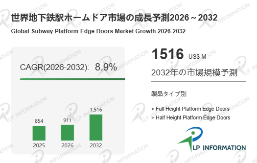 LP Informationの最新レポート「世界地下鉄駅ホームドア市場の成長予測2026~2032」(https://www.lpinformation.jp/reports/683940/subway-platform-edge-doors)によれば、地下鉄駅ホームドアの世界市場は2026~2032年にCAGR8.9%で安定的に拡大し、2032年には15.16億米ドルに達すると見込まれている。この成長の背景には、アジア太平洋地域を中心とした新興都市の地下鉄網整備、欧米成熟市場における既設ホームドアの更新需要、さらには中東・アフリカ地域の都市化プロセスに伴う新規地下鉄プロジェクトの増加がある。特に中国、インド、東南アジア諸国における大規模な都市軌道交通投資が市場成長を後押しし、安全基準の国際化と省エネ政策の普及により、高機能ホームドアの需要が増加する傾向にあり、長期的には安定した成長トレンドが継続すると予想される。