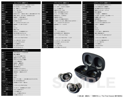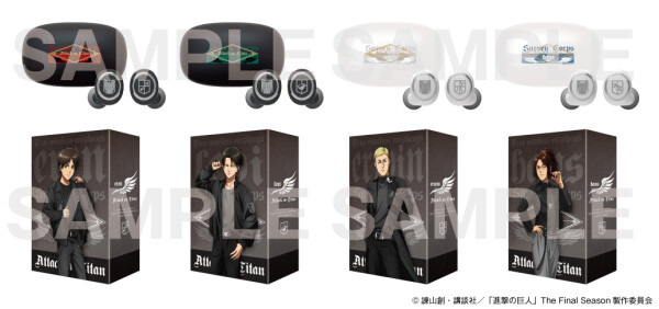 本コラボレーションモデルは「エレン」「リヴァイ」「エルヴィン」「ハンジ」の4モデル。作品タイトルと各キャラクター名のイメージモチーフを充電ケースに、自由の翼と各キャラクターのイメージモチーフを左右ハウジングプレートに配置。音声ガイダンスは「エレン」「リヴァイ」「エルヴィン」「ハンジ」それぞれの新規録り下ろしボイスを搭載。電源オンやオフ、ペアリング時やタップ音、ノイズキャンセリングモード時等、それぞれ計24ワードのボイスを楽しめます。パッケージは描き下ろしイラストデザインとなっております。