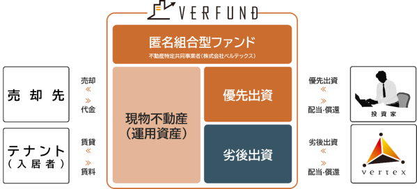 本サービスでは、資産運用を希望する投資家の皆さまから資金を募り、株式会社ベルテックスが運営するベルファンドを通じて不動産の運用を行い、その運用益や売却益を投資家の皆さまに分配する仕組みとなっております。