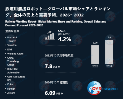 鉄道用溶接ロボットの世界市場規模は2025年に5.87百万米ドルに達し、2026年には6.09百万米ドルに拡大すると予測されております。2026年から2032年の期間においては、4.2%の年平均成長率(CAGR)を維持し、最終的に2032年の市場規模は7.8百万ドルに達すると予測されております。
