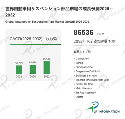 LP Information調査チームの最新レポートである「世界自動車用サスペンション部品市場の成長予測2026~2032」(https://www.lpinformation.jp/reports/763436/automotive-suspension-part)によると、2026年から2032年の予測期間中のCAGRが5.5%で、2032年までにグローバル自動車用サスペンション部品市場規模は865.36億米ドルに達すると予測されている。