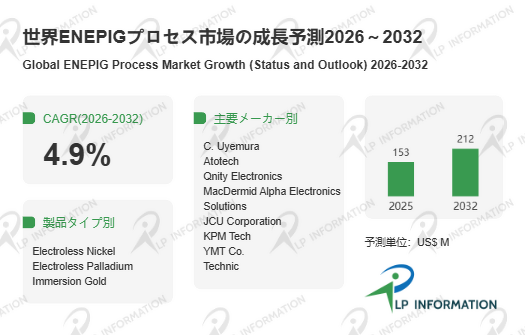 LP Information調査チームの最新レポートである「世界ENEPIGプロセス市場の成長予測2026~2032」(https://www.lpinformation.jp/reports/599243/enepig-process)によると、2026年から2032年の予測期間中のCAGRが4.9%で、2032年までにグローバルENEPIGプロセス市場規模は2.12億米ドルに達すると予測されている。市場を牽引する主な要因は、高信頼性電子部品の需要増加、次世代通信規格や高性能半導体製造の拡大、電子機器の小型化および高密度化である。一方、制約要因としては、貴金属価格の変動、工程の複雑性および初期設備投資コストの高さが挙げられる。さらに、新規参入企業による価格競争や技術模倣のリスクも存在する。しかし、高品質製品への依存度が高い市場構造により、技術力と実績を有する企業には依然として成長機会が豊富である。