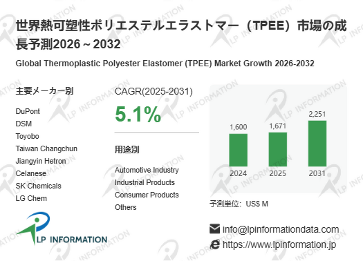 LP Information調査チームの最新レポートである「世界熱可塑性ポリエステルエラストマー(TPEE)市場の成長予測2026~2032」(https://www.lpinformation.jp/reports/577295/thermoplastic-polyester-elastomer--tpee)によると、2026年から2032年の予測期間中のCAGRが5.1%で、2032年までにグローバル熱可塑性ポリエステルエラストマー(TPEE)市場規模は22.51億米ドルに達すると予測されている。この成長の背景には、新エネルギー自動車の普及、医療機器や消費財分野の需求拡大、環境規制に伴う材料転換がある。特にアジア太平洋地域では生産拠点の集積と消費市場の拡大により成長が加速し、欧米市場では高規格製品のニーズが高まっている。成熟市場の更新需要と新興市場の新設需要が結びつき、中長期的な安定成長が期待される領域である。
