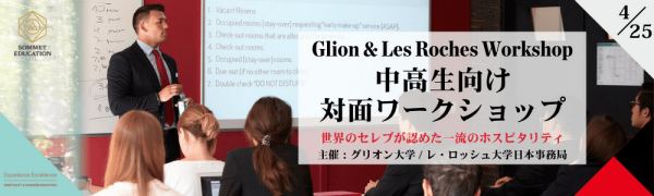 グリオン/レ・ロッシュ日本事務局は、2026年4月25日(土)に大学本部よりRegional Admission Managerを招き、ワークショップ(模擬授業)及び大学院進学セミナーを開催します。ホスピタリティ業界のリーダーを目指す中高生や、大学院進学やホスピタリティ業界での就職を目指している大学生、キャリアチェンジを検討している社会人の皆様に、世界トップクラスの教育プログラムとキャンパスライフ、キャリアについて詳しくご紹介します。