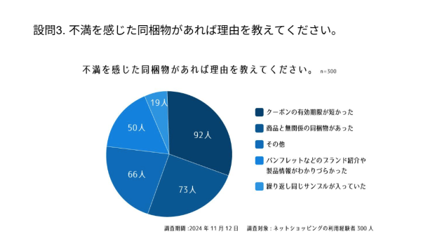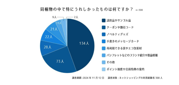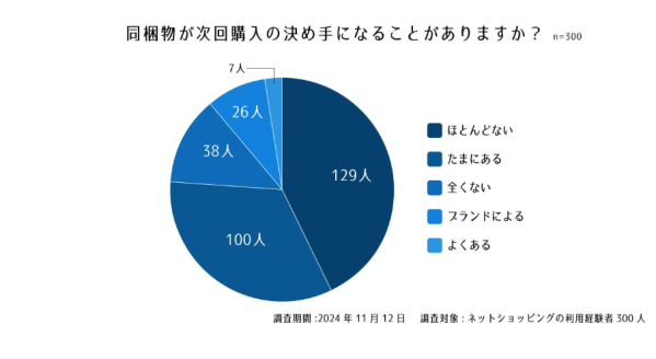 販売代行サービス「売る倉庫」を提供する醍醐倉庫株式会社(本社:東京都大田区)は、同梱物についてのアンケート結果を公開しました。同梱物は企業やブランド情報の提供や次回の購入を促進するためのツールとして重要な役割を果たしています。本調査では、消費者のニーズや不満、同梱物が企業やブランドにどのような印象を与えるかなどを実態調査し、分析しました。調査期間2024年11月12日調査対象20~60代以上のネットショッピングの利用経験者男女300人(女性170人、男性130人)設問1. 最近購入した商品には、どのような同梱物が入っていましたか?設問2. 同梱物の中で特にうれしかったものは何ですか?設問3. 不満を感じた同梱物があれば理由を教えてください。設問4. 同梱物が次回購入の決め手になることがありますか?配信元企業:醍醐倉庫株式会社プレスリリース詳細へドリームニューストップへ