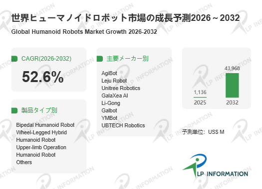 LP Information調査チームの最新レポートである「世界ヒューマノイドロボット市場の成長予測2026~2032」(https://www.lpinformation.jp/reports/577017/humanoid-robots)によると、ヒューマノイドロボット市場は2026~2032年にCAGR52.6%で推移し、2032年までに市場規模は439.68億米ドルへ到達すると予測されている。高い成長率が示すのは、単一用途の機械更新ではなく、複数産業にまたがる「新しい装置カテゴリ」が立ち上がる局面である点である。需要は一気に均質化せず、導入現場ごとに要件が分岐し、用途定義・安全要件・運用設計が同時に進むため、短期は検証と限定展開が混在しやすい。にもかかわらず、市場規模が明確に拡大する前提は、技術成熟と実装知の蓄積が連鎖し、調達・運用の意思決定が「試験導入」から「標準装備」へ移行し得ることを示唆する。