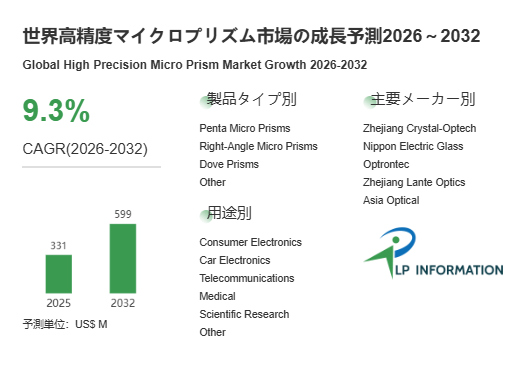 LP Information調査チームの最新レポートである「世界高精度マイクロプリズム市場の成長予測2026~2032」(https://www.lpinformation.jp/reports/659642/high-precision-micro-prism)によると、世界市場規模は2025年331百万米ドルから2032年599百万米ドルへ年率9.3%で成長し、2021年251百万米ドルからの伸びは中長期で加速する。世界的な発展特徴は、需要が単一業界に依存せず、スマートデバイス、車載センシング、光通信、医療の複数エンジンで同時に伸びる点である。スマートフォンでは望遠・薄型化の両立が光路折返しを常態化し、微小プリズムは高画質化の部材となる。車載では多眼化とセンサ融合が進み、耐環境と長期信頼性を満たす光学素子が必要となる。光通信では高密度化により微小光学部品の実装精度が厳格化し、医療では内視鏡や小型診断の高精細化が進む。結果として市場は、プロセス突破で伸びる局面から、量産一致性と供給能力で伸びる局面へ移行し、設備投資と品質保証体制の厚みが競争力そのものとなる。