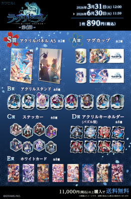 今回はアクリルパネルがS賞にラインナップ!美麗イラストがA5サイズの綺麗な印刷でご堪能いただけます。
