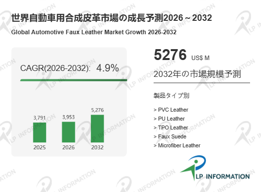 LP Information調査チームの最新レポートである「世界自動車用合成皮革市場の成長予測2026~2032」(https://www.lpinformation.jp/reports/740814/automotive-faux-leather)によると、2026年から2032年の予測期間中のCAGRが4.9%で、2032年までにグローバル自動車用合成皮革市場規模は52.76億米ドルに達すると予測されている。成長の質も変化している。単なる代替需要ではなく、電動化で静粛性が増す車室における触感・見映えの差別化、清掃性や抗菌などの機能付加、軽量化と部品点数削減を狙う一体成形・加飾統合、そしてサステナビリティ指標の開示が、合成皮革を内装設計の主役へ押し上げている。結果として、プレミアムではマイクロファイバー系の高付加価値領域が厚みを増し、量産では水系PUや溶剤低減・フタル酸フリー等の規制対応が標準化しつつある。