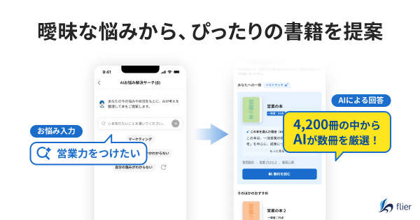 本の要約サービス「flier」は、出版社や著者から許諾を得た書籍を専門ライターと編集者が要約し、10分で読めるコンテンツとして配信するサービス。現在、要約数は4,200冊を超え、日々膨大な知見が蓄積されています。その一方で、従来の「書籍名・著者名」による検索では、ユーザが抱える「コミュニケーションが苦手」「部下の育成に悩んでいる」という曖昧な悩みや課題に対し、適切な書籍を提示しきれないという課題がありました。
