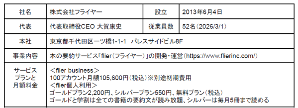 fllierは、1冊10分で読める「本の要約サービス」です。ビジネス書の新刊や話題のベストセラー、名著の要約をウェブ、アプリで毎日公開。AIを使った音声版もあります。収録書籍数は4,200冊超、累計会員数は130万人を突破しました(2026年3月現在)。その他、オンラインコミュニティ「flier book labo」や、全国の書店店頭でflierの要約ページをQRコードで“立ち読み”できるコラボフェアも展開中です。 ※QRコードの商標はデンソーウェーブの登録商標です。