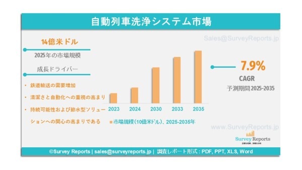 Surveyreportsの専門家による分析によれば、自動列車洗浄システム市場規模は2025年に14億米ドルであった。また、2035年末までに29億米ドルに達すると予測されている。さらに、2025年から2035年の予測期間において、年平均成長率(CAGR)は約7.9%で成長すると見込まれているものである。
