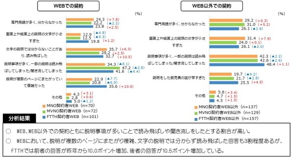 総務省によると、通信サービス(FTTH)をWeb上で契約した消費者で、十分に内容を理解できなかったと答えた方のうち、41.6%が「説明事項が多く、一部の説明は読み飛ばしてしまった」、次いで35.6%が「説明が複数のページにまたがっていて複雑だった」と回答。