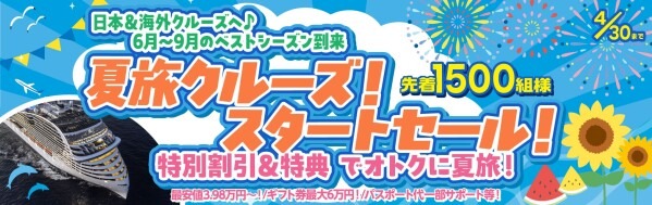 本セールは先着1,500組様限定で、日本発着・海外発着を問わず、人気クルーズを特別割引・特典付きでご案内いたします。