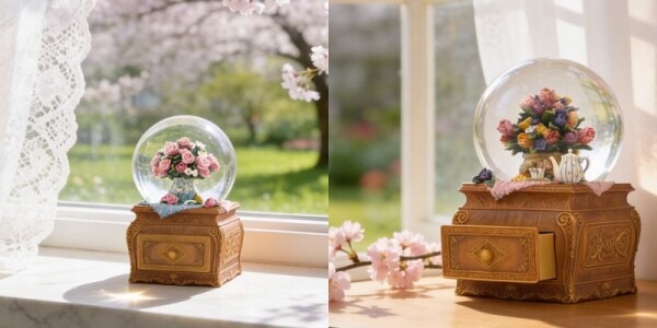 花モチーフのスノードームは、チューリップやバラを繊細に表現したデザインに加え、小物入れとしても使用できる実用性を兼ね備えています。