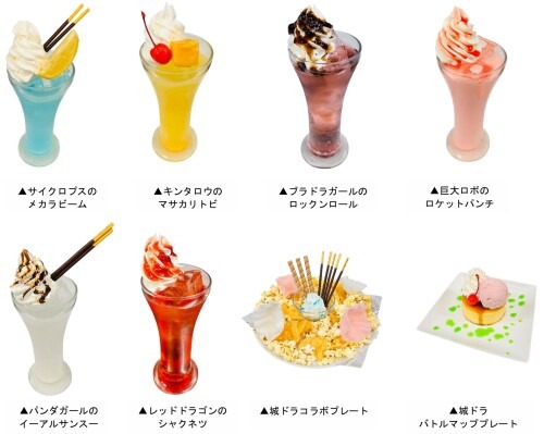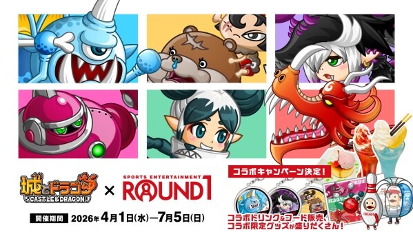 ROUND1対象店舗にて、「サイクロプス」「レッドドラゴン」「キンタロウ」「巨大ロボ」「パンダガール」「ブラドラガール」といった城ドラキャラがモチーフになったコラボドリンクが展開されます!ほかにも、「城ドラコラボプレート」「城ト?ラハ?トルマッフ?フ?レート」といったフードも登場!