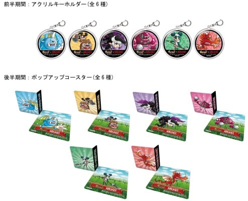 また、コラボメニューやアレンジドリンク・ポップコーンを注文すると、ランダムでノベルティを1種もらえます。コラボ前半は『アクリルキーホルダー(全6種)』、コラボ後半は『ポップアップコースター(全6種)』のラインナップとなっています。
