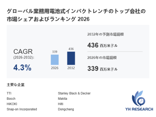 YHResearch調査チームの最新レポート「グローバル業務用電池式インパクトレンチのトップ会社の市場シェアおよびランキング 2026」によると、2026年の339百万米ドルから2032年には436百万米ドルに成長し、2026年から2032年の間にCAGRは4.3%になると予測されています。
