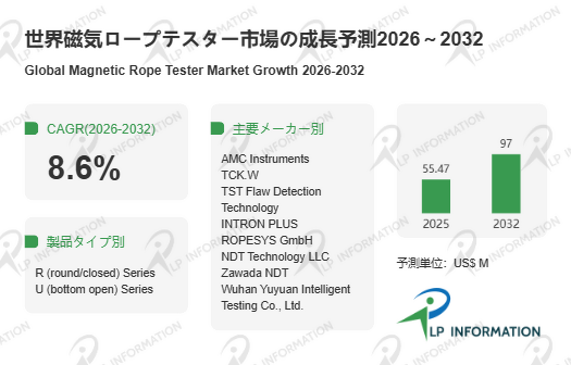 LP Information調査チームの最新レポートである「世界磁気ロープテスター市場の成長予測2026~2032」(https://www.lpinformation.jp/reports/599960/magnetic-rope-tester)によると、2026年から2032年の予測期間中のCAGRが8.6%で、2032年までにグローバル磁気ロープテスター市場規模は0.97億米ドルに達すると予測されている。市場成長の主なドライバーは、産業インフラ設備の老朽化による点検需要の増加、労働安全規制の強化、非破壊検査技術への依存度向上である。一方で、市場の制約要因としては、高精度装置の高価格、検査オペレーターの熟練度依存、現場環境による装置の運用制限などが存在する。また、競争激化や新興メーカーの低価格製品参入が市場リスクとなるが、技術革新による差別化は依然有効である。