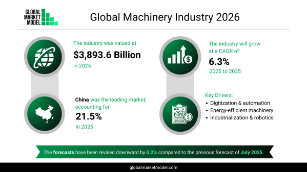 グローバルマーケットモデルによると、世界の機械市場は2025年に3兆8,936億ドルと評価され、2035年まで年平均成長率6.3%で成長すると予測されており、重点的かつ生産性主導の投資によって支えられている。