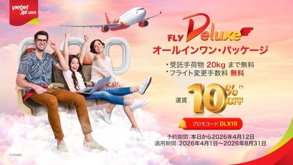 (東京, 2026年4月2日) - ベトジェットは、デラックスクラス運賃が10%割引、エコチケット運賃が100%割引になる期間限定のチケットプロモーションを実施し、世界中の旅行者の皆様に対し、ベトナムおよびその先の目的地へ向けた大変お得な夏の旅行プランをご提案します。同社は4月28日に、静岡 - ハノイ線の就航も予定しています。