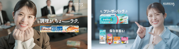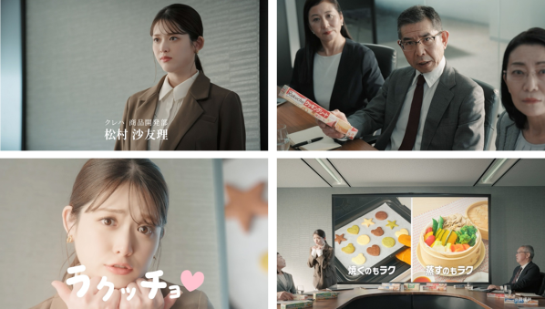 今回のCMでは、新ブランドの商品開発に情熱を注ぐ「クレハ社員」を、私??楽しみながら演じさせていただきました。調理が“ちょーラク”になる「Rakucho(ラクッチョ)」と、?材から??品まであれもこれも?れられる 「iremo(イレモ)」 。私自身、毎日バタバタと過ごしているので調理や日常の色々な場面で使える便利なアイテムに助けてもらいながら料理やお片付けを超可愛く楽しくやっていきたいです(ハード)