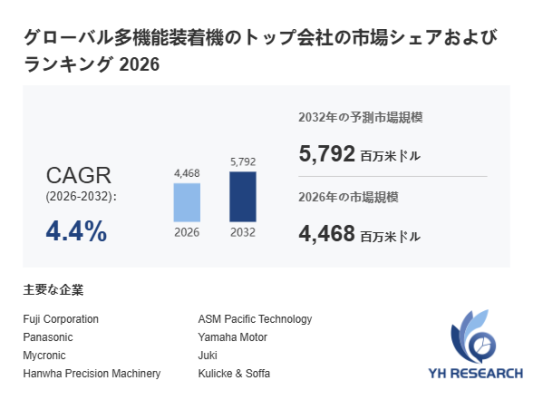 YHResearch調査チームの最新レポート「グローバル多機能装着機のトップ会社の市場シェアおよびランキング 2026」によると、2026年の4468百万米ドルから2032年には5792百万米ドルに成長し、2026年から2032年の間にCAGRは4.4%になると予測されています。