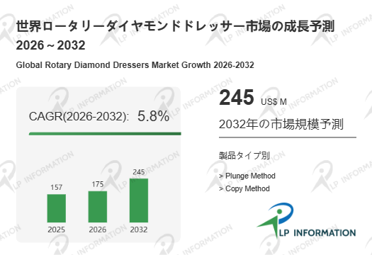 LP Information調査チームの最新レポート「世界ロータリーダイヤモンドドレッサー市場の成長予測2026~2032」(https://www.lpinformation.jp/reports/591694/rotary-diamond-dressers)によると、2026~2032年にかけて年平均成長率は5.8%と見込まれ、2032年には市場規模が2.45億米ドルに達する予測である。グローバルのロータリーダイヤモンドドレッサ市場は、中長期で緩やかな拡大局面にある。ここで重要なのは、同市場が「汎用品」ではなく、研削工程の再現性・品質保証・設備稼働を支える“工程部材”として評価される点である。需要は設備投資サイクルだけでなく、量産現場における品質基準の厳格化、加工条件の標準化、歩留まり管理の高度化といった製造管理の潮流に連動しやすい。結果として、景気循環に左右されにくい“工程起点の更新需要”が一定の厚みを持ち、専門市場でありながら安定的な成長曲線を形成しやすい構造を持つ。