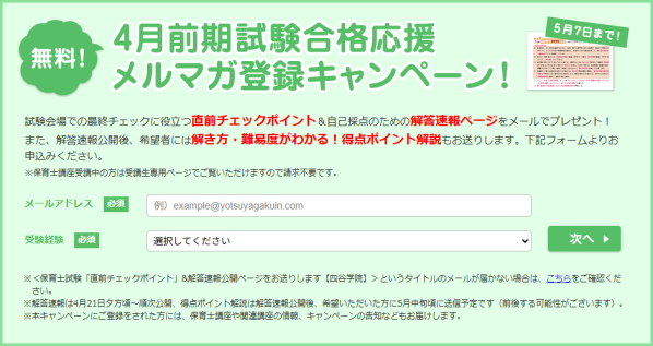 また、直前チェックポイントを請求してくださった方には、4月18日・19日に実施される保育士試験の解答速報ページにもご招待します。