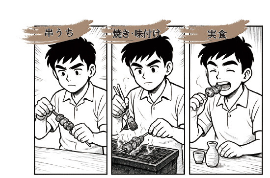体験コースでは、串うち・下味付け・焼き工程まで、職人の仕事を実際に体験できる。