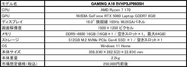 GAMING A16 5VHP3JP893SHの主な仕様は以下のとおりです。