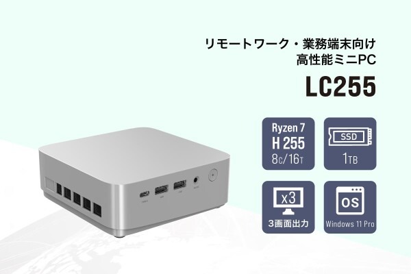 LC255は、AMD Ryzen(TM) 7 H 255 Processorを搭載した高性能ミニPCです。約13cm四方の極めてコンパクトな筐体に8コア16スレッドのCPUと24 GBのメインメモリ、1 TBのM.2 Nvmeを搭載しています。HDMIとDisplayPort、Type-Cを組み合わせて最大3画面同時出力が可能なため、最小限のスペースでマルチモニタの環境にも対応します。高いコストパフォーマンスとコンパクト設計により、オフィスPCやリモートワーク用PCの省スペース化はもちろん、業務用端末や組込みなど法人用途にも最適です。