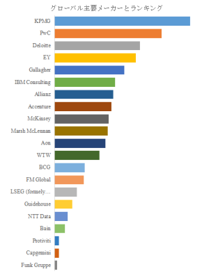 リスクマネジメントコンサルティング市場は、高い集中度を特徴とする。KPMGが最大シェアを占め、PwC、Deloitte、EYといったビッグフォーが強固な基盤を構築している。これら企業は、監査・税務・アドバイザリーを横断する総合力を背景に、ガバナンス、規制対応、サイバー、ESGまで一気通貫で提供する体制を有する。加えて、Marsh McLennan、Aon、WTW、Gallagherといった保険ブローカー系は、リスク定量化と保険設計を融合させた独自モデルで存在感を示す。Accenture、IBM Consulting、Capgemini、NTT Dataは、テクノロジーとデータ分析を核に、デジタルリスク領域で競争優位を確立している。McKinsey、BCG、Bainは、戦略とリスクを統合した経営アジェンダとして提供し、取締役会レベルの信頼を獲得している。この多層的競争構造は、クライアントの課題高度化に応じた専門分化と統合の両立を促し、市場全体の価値密度を高めている。