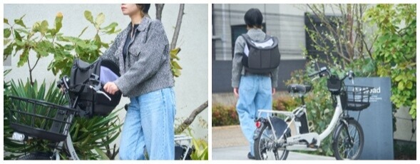 「ハグバディー」は、従来のバスケットとは違い、ハンドルの内側に固定します。近い距離でいつでも様子が確認できるため、飼い主・ペットともに安心感を持って移動できます。外の景色を一緒に楽しめるよう、安全性を確保しつつ、走行中もペットが顔を出せる蓋のデザインにこだわりました。固定には、当社の自転車用バスケットなどで採用している独自の着脱機構を応用。強固な固定力を持ちながら、ワンタッチで簡単に取り外せるため、自転車での移動から到着後の徒歩移動まで、このリュックひとつでスムーズに切り替えられる新しいスタイルを実現しました。一人で自転車に乗るときは、アタッチメントベースを折りたためるため邪魔になりません。