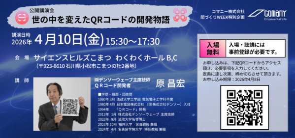 間仕切りで新たな価値を創造する間づくりカンパニーのコマニー株式会社(本社:石川県小松市、代表取締役社長執行役員:塚本健太)は、2026年4月10日にQRコードの開発者である、株式会社デンソーウェーブ主席技師、原 昌宏氏をお招きし、講演会の開催することをお知らせします。