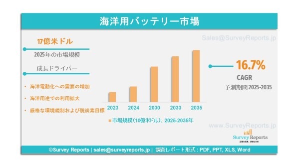 Surveyreportsの専門家による分析によれば、海洋用バッテリー市場規模は2025年に17億米ドルであった。また、2035年末までに69億米ドルに達すると予測される。さらに、2025年から2035年の予測期間において、年平均成長率(CAGR)は約16.7%で成長すると見込まれている。