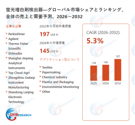 蛍光増白剤検出器の世界市場規模は、2025年には約138百万米ドルに達すると推計されています。2026年には145百万米ドル規模へと拡大する見込みであり、その後も安定した成長軌道を維持すると想定されています。2026年から2032年の期間においては、年平均成長率(CAGR)5.3%で推移し、2032年には市場規模が約197百万米ドルに達する見通しです。