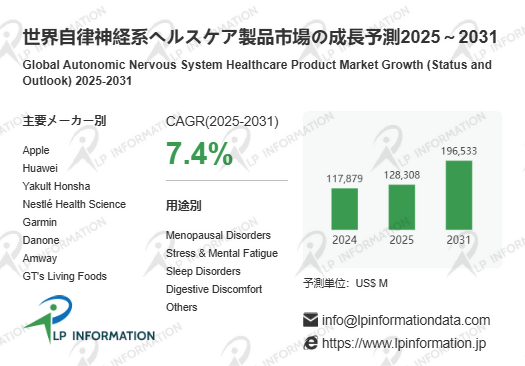 LP Information調査チームの最新レポートである「世界自律神経系ヘルスケア製品市場の成長予測2025~2031」(https://www.lpinformation.jp/reports/596266/autonomic-nervous-system-healthcare-product)によると、2025年から2031年の予測期間中のCAGRが7.4%で、2031年までにグローバル自律神経系ヘルスケア製品市場規模は1965.3億米ドルに達すると予測されている。ヘルスケア市場の中でも自律神経領域は極めて注目度が高く、背景には三つの構造変化がある。一つ目は、ストレス社会の慢性化とメンタルヘルス需要の爆発的拡大である。従来の医療依存型モデルでは補いきれない領域を、個別最適化されたデータドリブンなセルフケアが補完している。二つ目は、ウェアラブルセンサーの普及とAI解析技術の進化である。自律神経の揺らぎを高精度で計測し、生活習慣の改善やパフォーマンス最適化につなげる即時性が市場価値を高めている。三つ目は、食品・サプリメント・飲料などの「機能性ヘルスフード」とデジタルヘルスの融合である。メーカー各社が生体指標と摂取習慣を掛け合わせ、デジタルとリアルを統合したソリューションモデルへシフトしつつある。こうした潮流により、自律神経系ヘルスケア市場はウェルビーイング産業の中核領域として進化している。