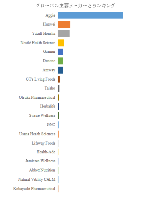 本市場では、テクノロジー企業、食品健康ブランド、サプリメント企業が入り混じる独特の競争構造が形成されている。世界ランキングではAppleがトップに立ち、続いてHuawei、Yakult本社、Nestlé Health Science、Garmin、Danone、Amwayなど多様な業態が名を連ねている。AppleやHuaweiはウェアラブルデバイスと生体解析アルゴリズムを武器に、自律神経指標の可視化とユーザーエコシステムの構築を加速している。一方、Yakult本社、Nestlé、Danone、Otsukaなど食品・飲料系企業は、腸内環境、乳酸菌、機能性成分と自律神経バランスの関連性を科学的に示し、継続摂取によるデータ化を推進するモデルで差別化を図る。Garminのようなスポーツ科学系企業は、HRV解析とトレーニング負荷管理を融合させ、アスリート市場で強固な地位を築いている。