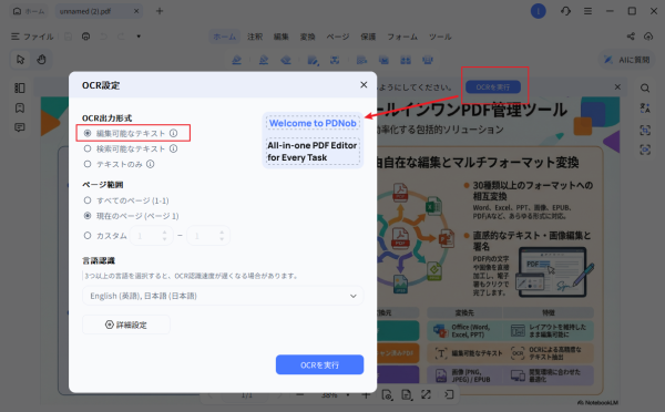 上部メニューの「OCRを実行」をクリックして文字認識を開始します。必要に応じてOCRモジュールをダウンロードします。その後、「編集可能なテキスト」モードを選択します。