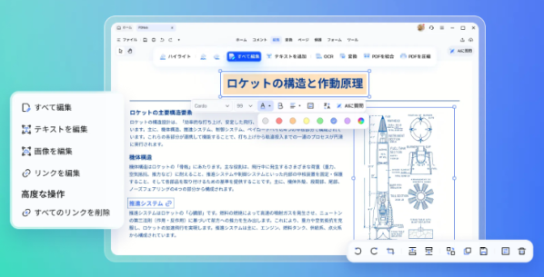 テキストの追加・修正はもちろん、カーニングや行間、フォントスタイルなど細かな書式設定にも対応。レイアウト全体を直感的に調整でき、PDFを思い通りに編集できます。