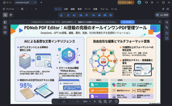 PDNob 2.0は、従来のPDF編集の枠を超え、「読む・編集する」から「理解する」へと進化。AI機能、OCR精度、操作性、パフォーマンスの全面刷新により、より効率的で直感的なドキュメントワークフローを実現します。