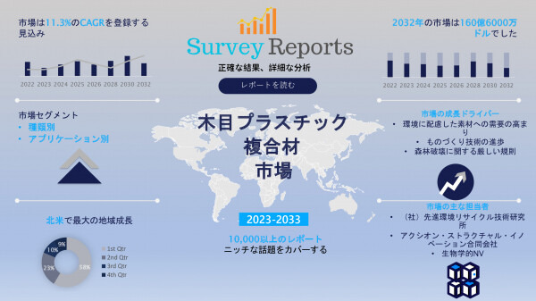 Surveyreportsのアナリストによる定性的なウッドプラスチック複合材(WPC)市場分析によると、環境にやさしい素材への需要の高まり、製造技術の進歩、森林伐採に関する厳格な規則、建設部門における需要の増加、建設および自動車部門における用途の拡大により、ウッドプラスチック複合材の市場規模は拡大するだろう。ウッドプラスチック複合材市場における主要企業の一部は、アドバンスト・エンバイロメンタル・リサイクル・テクノロジーズ社(AERT), アクシオン・ストラクチュラル・イノベーションズLLC, ベオロジックN.V., CertainTeed Corporation, ファイベロン社, Fkur Kunststoff GmbH, 広州キングウッド有限公司, Jelu-Werk Josef Ehrler GmbH & Co. KG, ウッドマス, ポリプランクAB, レノリット, タムコ・ビルディング・プロダクツ, ティンバーテック, トレックス社, ユニバーサルフォレストプロダクト