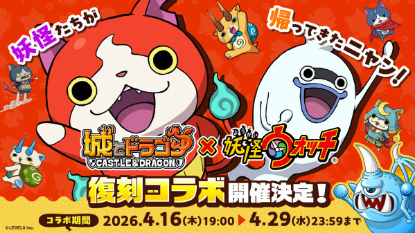 4月16日(木)より『城とドラゴン』にて『妖怪ウォッチ』との復刻コラボイベントを開催することが決定いたしました。コラボ限定キャラの新お着替え「ダークニャン」や、城ドラキャラの新しい激レアお着替えが登場するほか、4月9日(木)からXにて「コラボ直前!フォロー&リポストキャンペーン」を実施いたします。キャンペーンへのご参加お待ちしております!