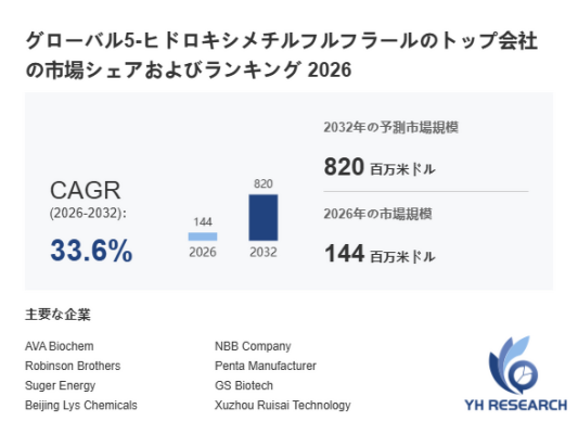YHResearch調査チームの最新レポート「グローバル5-ヒドロキシメチルフルフラールのトップ会社の市場シェアおよびランキング 2026」によると、2026年の144百万米ドルから2032年には820百万米ドルに成長し、2026年から2032年の間にCAGRは33.6%になると予測されています。